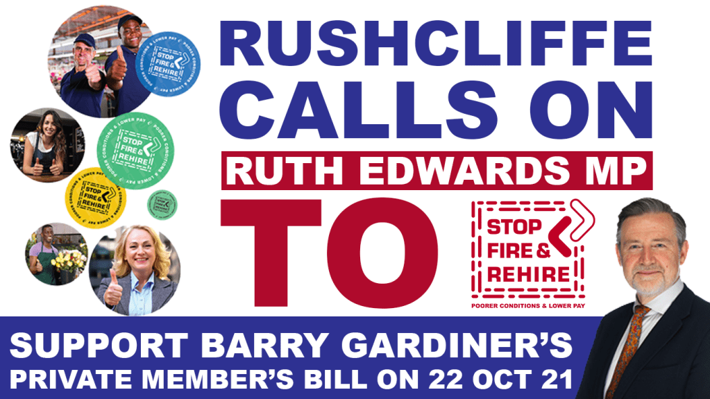 We, the undersigned residents of Rushcliffe constituency, believe the so-called practice of “Fire and Rehire” is unacceptable and morally wrong. It has no place in good business and is harming communities across our region. We believe better regulation should be in place to Stop Fire and Rehire and ask you to vote in support of the Private Member’s Bill of Barry Gardiner MP.